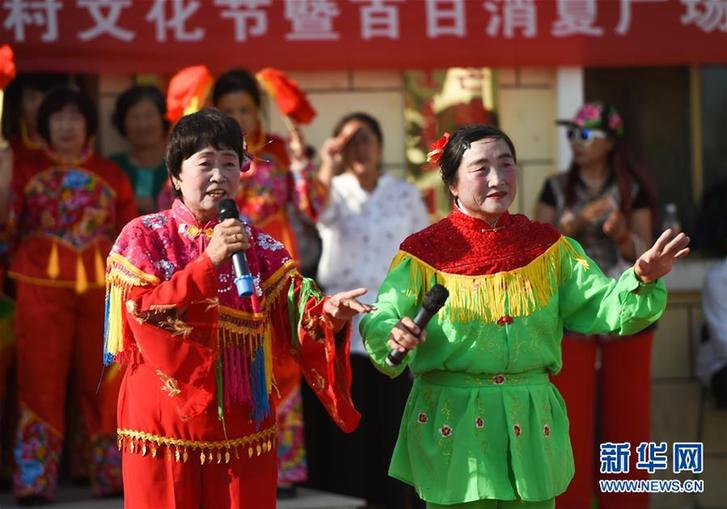 在內(nèi)蒙古鄂爾多斯市杭錦旗獨(dú)貴塔拉鎮(zhèn)芒哈圖村舉辦的“民生集市”上,民間文藝團(tuán)體的演員在表演二人臺(6月8日攝)。新華社記者 彭源 攝