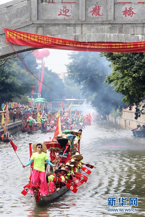 6月14日,在廣州天河區(qū)一處河道,一艘龍舟通過“迎龍橋”。當(dāng)日,廣州市天河區(qū)舉行一場熱鬧歡快的龍舟活動,來自多個村莊“走親戚”的龍舟隊參加。按廣州的傳統(tǒng)習(xí)俗,每年農(nóng)歷五月初一至初五,各村的龍舟隊要到周圍村落“走親戚”。走親戚的龍舟隊到來時,受訪村子要準(zhǔn)備好龍舟飯招待來客?;顒赢?dāng)天,鳴炮敲鑼,一派喜慶氣氛。新華社記者 張加揚(yáng) 攝