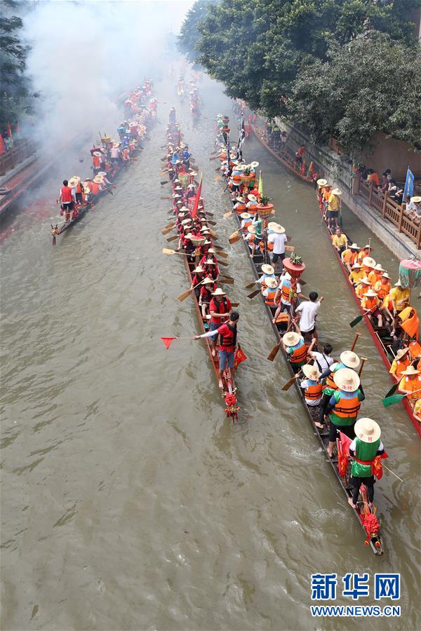 6月14日,多個(gè)村的龍舟隊(duì)在廣州市天河區(qū)一處河道劃龍舟。當(dāng)日,廣州市天河區(qū)舉行一場(chǎng)熱鬧歡快的龍舟活動(dòng),來(lái)自多個(gè)村莊“走親戚”的龍舟隊(duì)參加。按廣州的傳統(tǒng)習(xí)俗,每年農(nóng)歷五月初一至初五,各村的龍舟隊(duì)要到周?chē)迓洹白哂H戚”。走親戚的龍舟隊(duì)到來(lái)時(shí),受訪(fǎng)村子要準(zhǔn)備好龍舟飯招待來(lái)客。活動(dòng)當(dāng)天,鳴炮敲鑼?zhuān)慌上矐c氣氛。新華社記者 張加揚(yáng) 攝