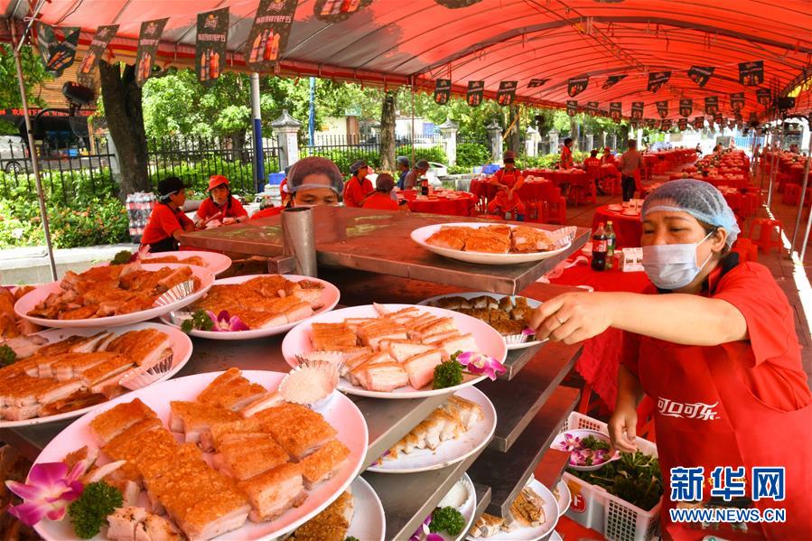 6月14日,工作人員在廣州天河區(qū)珠村七夕廣場準(zhǔn)備龍舟飯。當(dāng)日,廣州市天河區(qū)舉行一場熱鬧歡快的龍舟活動,來自多個村莊“走親戚”的龍舟隊參加。按廣州的傳統(tǒng)習(xí)俗,每年農(nóng)歷五月初一至初五,各村的龍舟隊要到周圍村落“走親戚”。走親戚的龍舟隊到來時,受訪村子要準(zhǔn)備好龍舟飯招待來客。活動當(dāng)天,鳴炮敲鑼,一派喜慶氣氛。新華社記者 鄧華 攝