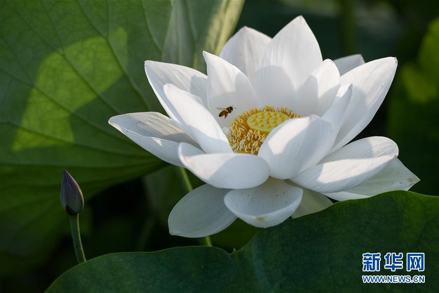 6月14日,在銅陵市西湖村荷花園內(nèi),一只蜜蜂飛向盛開(kāi)的荷花。隨著氣溫升高,安徽省銅陵市西聯(lián)鎮(zhèn)西湖村荷花園內(nèi)的300多畝荷花絢麗綻放,吸引游客前來(lái)賞荷。 新華社記者 張端 攝