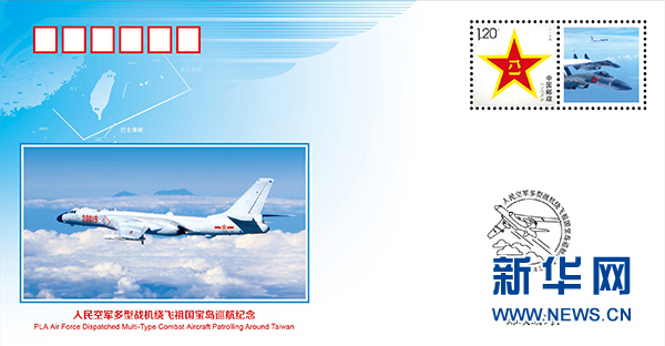 這次發(fā)行的一套兩枚中英文版紀(jì)念封,是中國(guó)集郵總公司根據(jù)新華社公開(kāi)播發(fā)的有關(guān)報(bào)道和新聞?wù)掌O(shè)計(jì)制作,記錄了空軍轟-6K等多型戰(zhàn)機(jī)多次繞飛祖國(guó)寶島巡航的航跡。