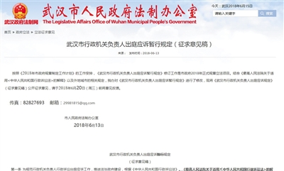 6月13日,武漢市政府法制辦官網(wǎng)發(fā)布《武漢市行政機(jī)關(guān)負(fù)責(zé)人出庭應(yīng)訴暫行規(guī)定》。圖/武漢市政府法制辦官網(wǎng)