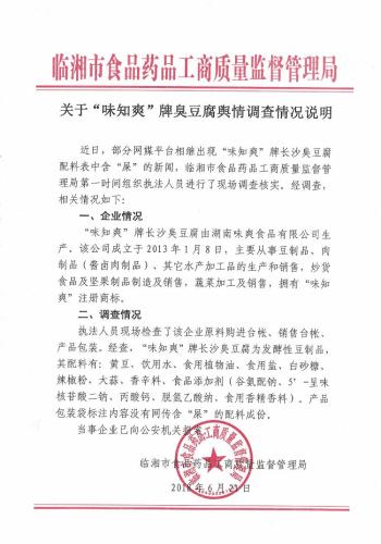 情況說(shuō)明指出,近日,部分網(wǎng)媒平臺(tái)相繼出現(xiàn)“味知爽”牌長(zhǎng)沙臭豆腐配料表中含“屎”的新聞,臨湘市食品藥品工商質(zhì)量監(jiān)督管理局第一時(shí)間組織執(zhí)法人員進(jìn)行了現(xiàn)場(chǎng)調(diào)查核實(shí)。