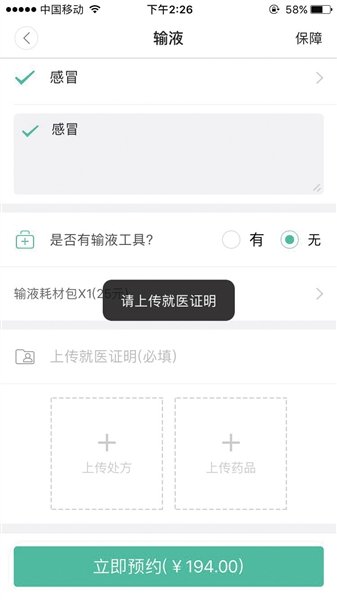 某“共享護(hù)士”平臺(tái)要求預(yù)約時(shí)提供就醫(yī)證明,但記者提供虛假資料也能通過(guò)審核。 手機(jī)截圖