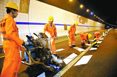 昨天上午,在懷柔區(qū)分水嶺隧道,路政養(yǎng)護(hù)人員正在安裝各類交通安全標(biāo)識。隨著防撞護(hù)欄、反光輪廓、視覺減速標(biāo)識陸續(xù)安裝完成,幽暗狹長的隧道變得明亮起來。據(jù)介紹,反光輪廓和視覺減速標(biāo)識首次在京隧道投入使用,無論白天還是夜間,明亮的標(biāo)識都能引導(dǎo)司機看清路面。
