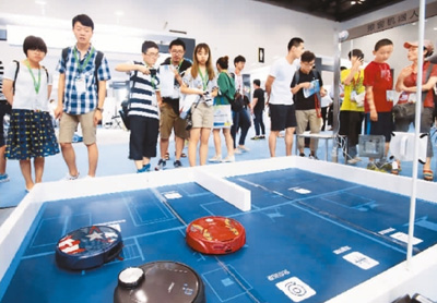 參觀者在北京國際消費電子博覽會上觀看掃地機器人。 陳曉根攝(人民圖片)
