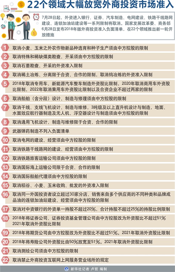 新華社北京6月28日電(記者安蓓、陳煒偉)7月28日起,外資進入銀行、證券、汽車制造、電網建設、鐵路干線路網建設、連鎖加油站建設等一系列限制將取消。國家發(fā)展改革委、商務部28日發(fā)布2018年版外商投資準入負面清單,在22個領域推出新一輪開放措施。