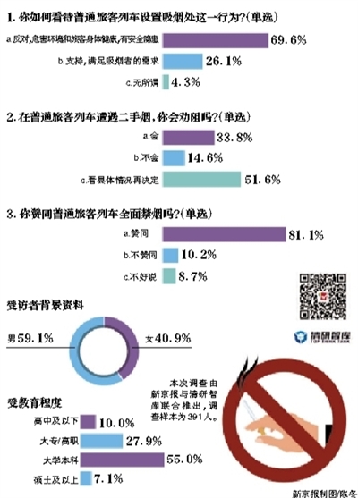 2017年6月,因在普通旅客列車上遭遇二手煙,大學(xué)生李華將哈爾濱鐵路局告上法庭,索賠購票款102.5元,同時要求取消有關(guān)站臺及該趟列車內(nèi)的吸煙區(qū)、拆除煙具,禁止在上述區(qū)域吸煙,并賠償精神損失費人民幣1元等。6月25日下午,北京鐵路運輸法院作出一審判決,要求鐵路局在相關(guān)列車上拆除煙具,取消吸煙區(qū)。被告人哈鐵局稱,“我國有3億吸煙者,提高服務(wù)質(zhì)量應(yīng)體現(xiàn)在對上述人群進行疏導(dǎo)而不是全面禁煙”。對此,我們需要關(guān)注什么?本期“京報調(diào)查”(新京報與清研智庫聯(lián)合推出)就此展開調(diào)查。