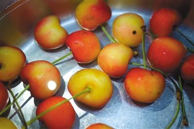 6月26日,鹽水浸泡中的櫻桃,沒有發(fā)現(xiàn)小蟲子。新京報(bào)記者 王嘉寧 攝