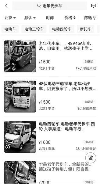 除了新車,北青報(bào)記者發(fā)現(xiàn),在二手貨交易平臺(tái)上,北京本地的老年代步車等違規(guī)電動(dòng)車也可以正常交易。