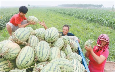 今年初,我們6戶居民聯(lián)合承包了村里300畝土地種植西瓜