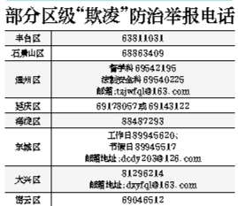 北京青年報記者注意到,東城、海淀、朝陽、豐臺、石景山、延慶等各區(qū)都建立了由多部門共同組成專門的防治中小學校欺凌領(lǐng)導小組,來統(tǒng)籌領(lǐng)導和指導本區(qū)學生欺凌防治工作,協(xié)助各中小學校穩(wěn)妥處置欺凌事件。在設立專門領(lǐng)導小組的同時,豐臺、石景山、通州、延慶以及海淀等區(qū)還公布了區(qū)級的中小學校園欺凌專屬的防治、舉報聯(lián)系電話。