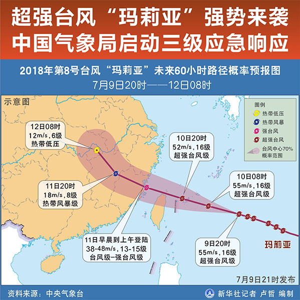 中央氣象臺(tái)預(yù)報(bào),今年第8號(hào)超強(qiáng)臺(tái)風(fēng)“瑪莉亞”中心9日8時(shí)位于臺(tái)灣省宜蘭縣東偏南方約1260公里的西北太平洋洋面上。預(yù)計(jì)將以每小時(shí)30公里左右的速度向西偏北方向移動(dòng),逐漸向臺(tái)灣以東洋面靠近,將于10日夜間登陸或擦過(guò)臺(tái)灣東北部,并于11日早晨到上午在福建晉江到浙江溫州之間沿海再次登陸。登陸后繼續(xù)向西北方向移動(dòng),強(qiáng)度逐漸減弱。
