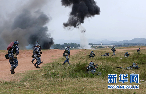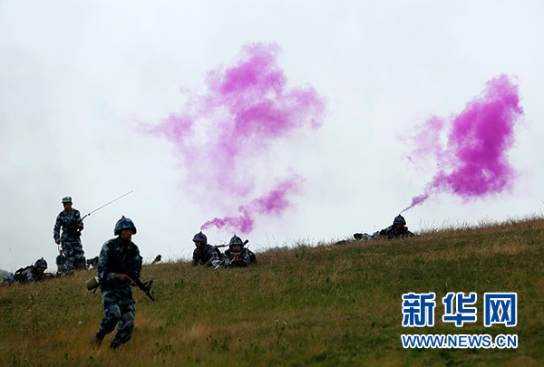 紅藍(lán)對(duì)抗中,殲“敵”信號(hào)發(fā)射后,“紅軍”主攻隊(duì)在模擬連連長(zhǎng)指揮下,按照戰(zhàn)術(shù)編組發(fā)起進(jìn)攻(資料照片)。新華社發(fā)(姚立 攝)