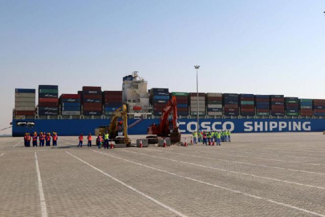 ↑2017年11月5日在阿聯(lián)酋拍攝的中遠(yuǎn)海運(yùn)港口阿布扎比碼頭正式動(dòng)工暨場(chǎng)站租賃簽約儀式現(xiàn)場(chǎng)。 新華社記者蘇小坡攝