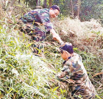 一次,護(hù)林員巡山回來報(bào)告,一處偏遠(yuǎn)林地被人侵占,種了100多棵桉樹苗。許雄堅(jiān)和工區(qū)長(zhǎng)騎上摩托車,趕去現(xiàn)場(chǎng)。半道上,十幾個(gè)村民攔住他倆,不由分說,推倒摩托車,還持棒威脅說“誰敢動(dòng)一棵桉樹就打殘誰”。