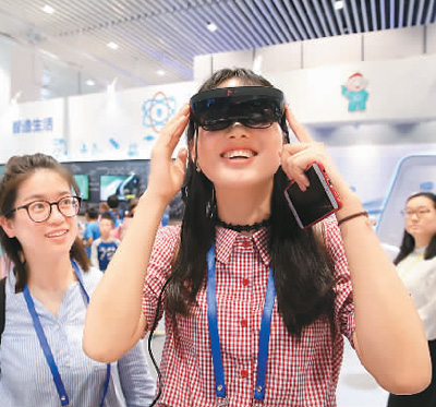 5月19日,參觀者在北京科技周上體驗(yàn)國際上首款量產(chǎn)版全高清AR智能眼鏡。陳曉根攝(人民視覺)