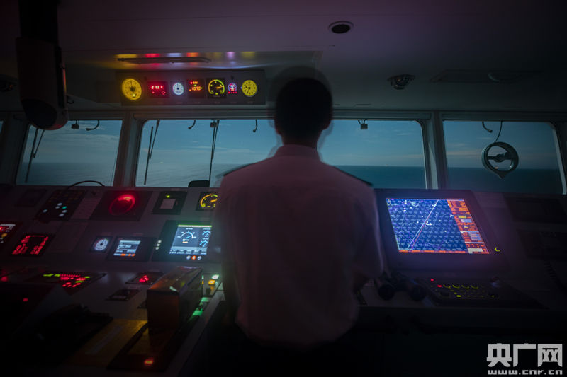 使上好大勁兒才推開駕駛室那道門,三副陳澤龍正站在正中間的操作臺旁,緊盯著眼前有近百種大大小小的儀器設(shè)備磁航儀、雷達(dá)儀等,他周圍的操作臺、海圖室、駕駛員休息區(qū)界限分明。不同于樓下的一個(gè)個(gè)小房間,駕駛臺相當(dāng)寬敞,再加上270度的全景玻璃窗,白天的話視野一定極好,但仍逃脫不了單調(diào)的“海天圖”。