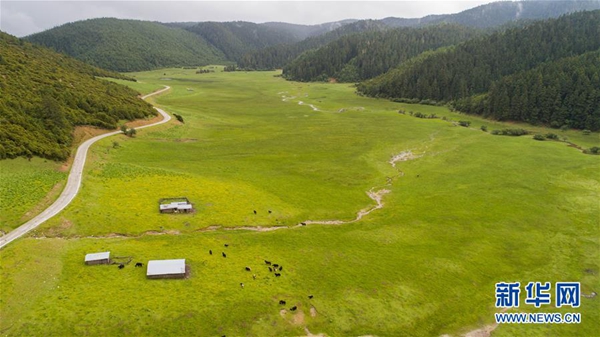 普達措國家公園彌里塘片區(qū)風景(7月18日無人機拍攝)。 新華社記者 胡超 攝