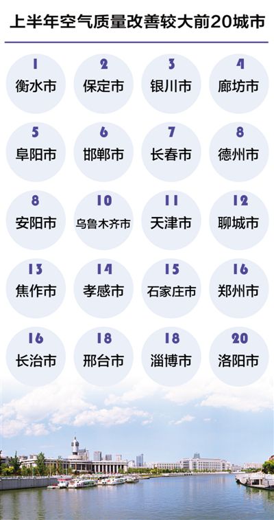 今年上半年,169個(gè)城市中,臨汾、石家莊、邢臺(tái)等20個(gè)城市空氣質(zhì)量相對(duì)較差;海口、黃山、拉薩等20個(gè)城市空氣質(zhì)量相對(duì)較好。與去年同期相比,169個(gè)城市中,衡水、保定、銀川等20個(gè)城市空氣質(zhì)量改善幅度相對(duì)較好;常州、西寧、嘉興等20個(gè)城市空氣質(zhì)量改善幅度相對(duì)較差。