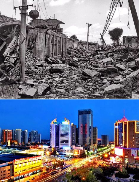 拼版照片:上圖為唐山市震后照片(資料照片)。下圖為2016年5月17日拍攝的唐山市夜景(新華社記者 楊世堯 攝)。