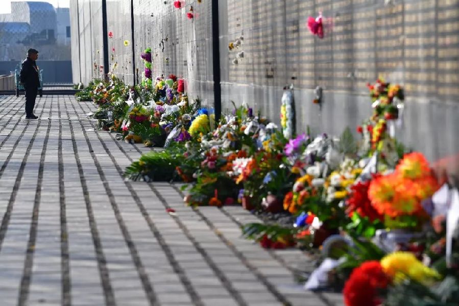 2018年4月4日,一名市民在唐山地震紀念墻前悼念逝者。新華社發(fā)(董鈞 攝)