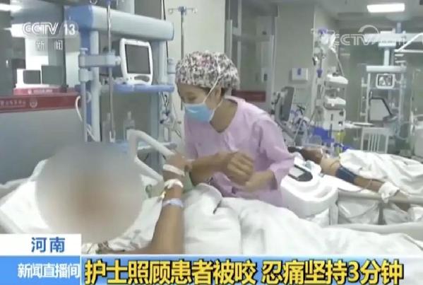 近日,在河南新鄉(xiāng)市醫(yī)學(xué)院第一附屬醫(yī)院的急診監(jiān)護(hù)室內(nèi),護(hù)士劉珊在照料重傷病患時(shí),手臂突然被患者咬住。因?yàn)閾?dān)心掙脫會導(dǎo)致病人身上的插管脫落,劉珊就一直沒有將手臂拿開。直到醫(yī)護(hù)人員給患者打了鎮(zhèn)靜劑后,患者才慢慢松開了牙齒,此時(shí)劉珊已經(jīng)堅(jiān)持了3分鐘。