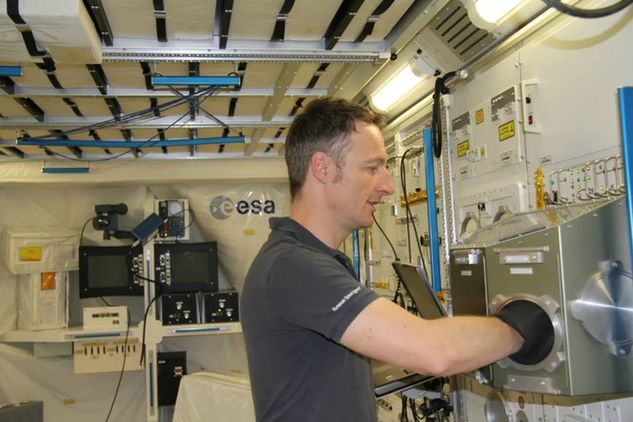 馬天在歐航局“哥倫布”實(shí)驗(yàn)艙模擬艙內(nèi)展示實(shí)驗(yàn)操作。(新華社記者張毅榮攝)