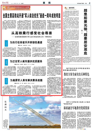 去年8月1日,中國鐵路總公司、軍委后勤保障部聯(lián)合決定,在全國鐵路系統(tǒng)開展軍人出行依法優(yōu)先工作。這項政策實施一年來成效如何?記者走進高鐵站進行了采訪調(diào)查,實地探訪“軍人依法優(yōu)先”給官兵出行帶來的新變化。請關(guān)注今天出版的《解放軍報》的報道——