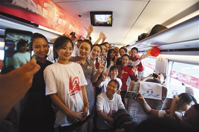 8月1日,乘客與乘務(wù)員在京津城際復(fù)興號列車內(nèi)合影。新京報記者 王貴彬 攝