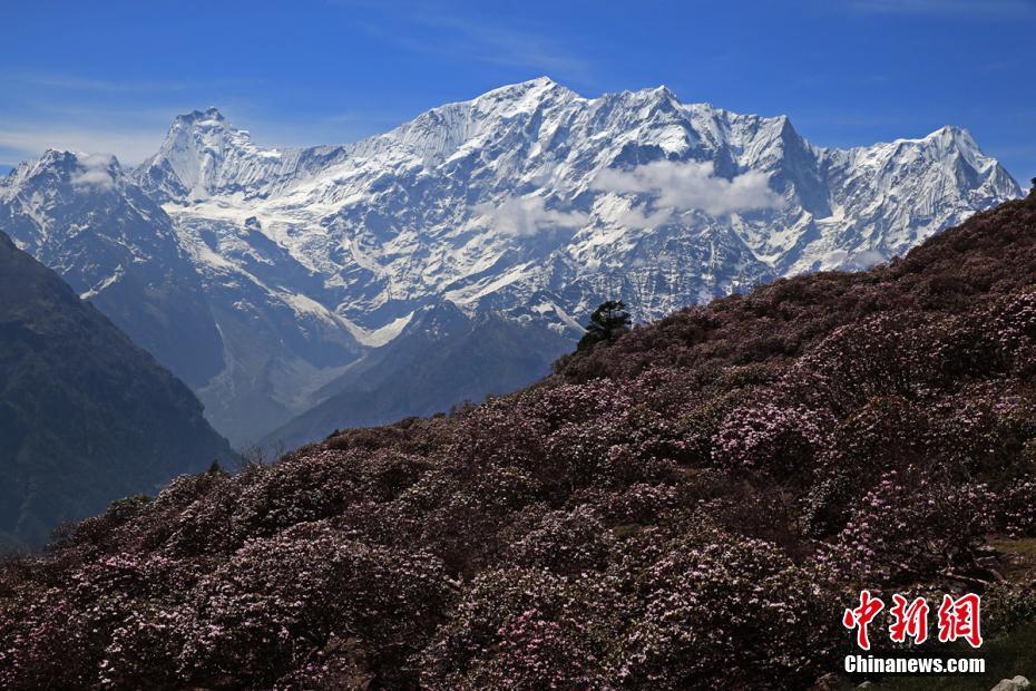 吉隆溝給人最大的感受是驚訝于造物的神奇,讓四季并存在這狹小的山谷間。峽谷綠樹(shù)成蔭,恬靜的村莊被綠樹(shù)環(huán)抱著,不遠(yuǎn)處能清楚地看見(jiàn)若隱若現(xiàn)的雪山。圖為杜鵑花與尼泊爾朗塘雪山交相輝映。 楊建 攝