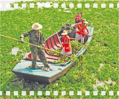武漢水上管理處清漂隊(duì)在長(zhǎng)江漢口段打撈水葫蘆。資料圖片