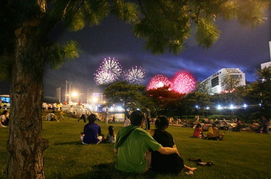 2008年8月2日,北京永定門,一對情侶觀看北京奧運會開幕式預演的煙花。戴冰/攝