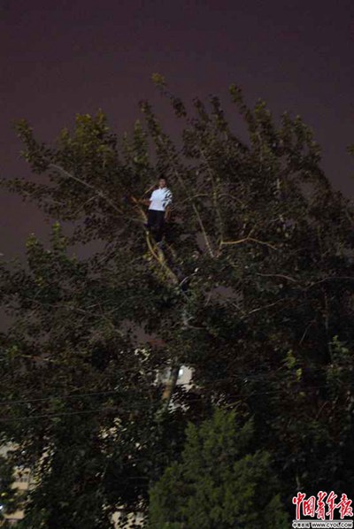 2008年8月8日,北京華嚴里小區(qū),兩名男子在樹上觀看奧運會開幕式的煙花。中國青年報·中青在線記者 李雋輝/攝