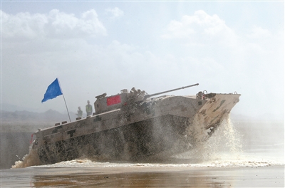 “蘇沃洛夫突擊”步戰(zhàn)車組項目比賽中,中國參賽隊戰(zhàn)車穿越涉水場。袁 凱攝