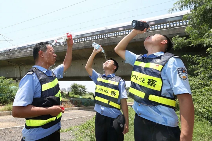 武漢鐵路公安處烏龍泉東所民警冒酷暑巡查后進(jìn)行“降溫處理”。胡金力 攝