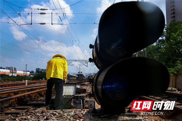 中國鐵路廣州局集團有限公司長沙電務段員工們不畏高溫,堅守在鐵路一線,作業(yè)人員正在對道岔設(shè)備進行調(diào)試。