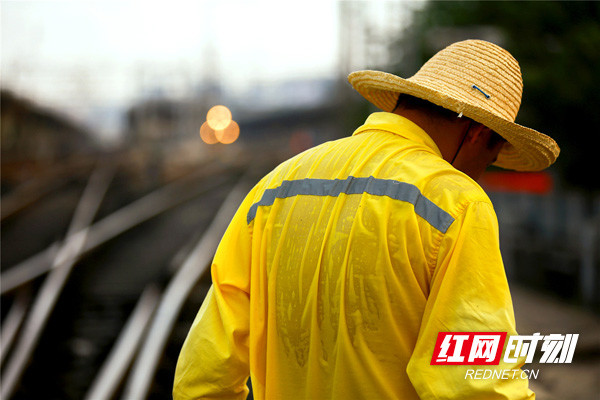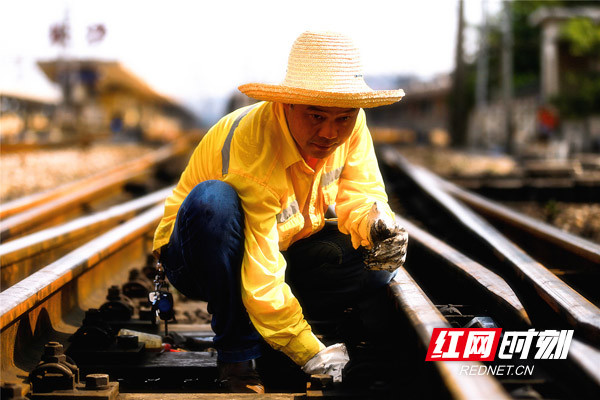 在相隔不到20米的作業(yè)地點,長沙信號工區(qū)工長胡正海帶領(lǐng)工友們對另一處道岔、軌道電路等設(shè)備進行巡視和設(shè)備注油作業(yè)?!叭藭蚋邷靥鞖怙@得更加疲憊,設(shè)備也會受到高溫天氣的影響,所以無論太陽多么炙熱,設(shè)備巡視必不可少。”胡正海一邊擦汗一邊介紹。