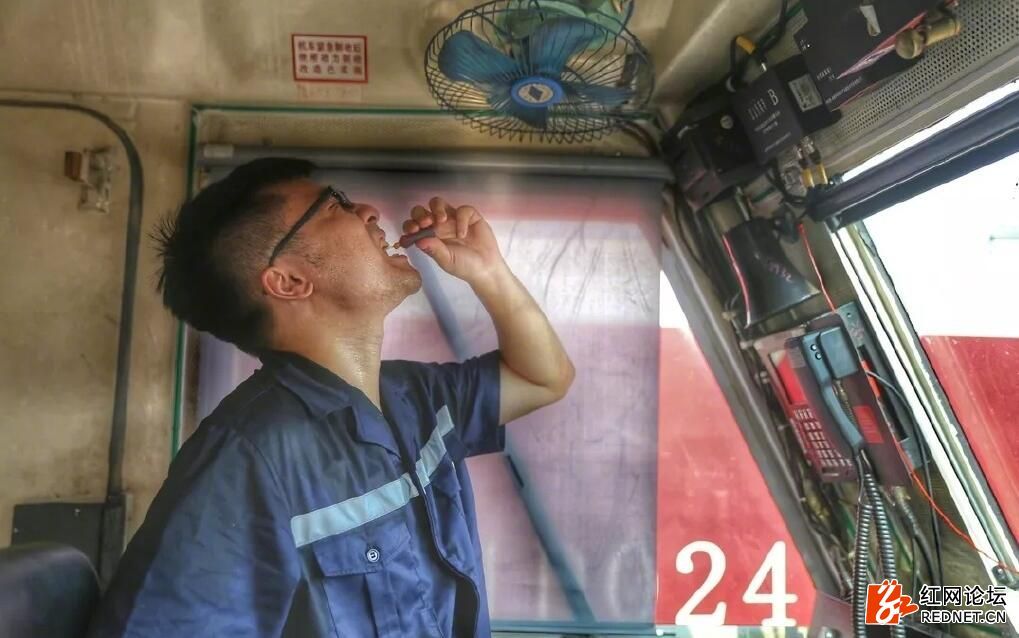 庫內(nèi)的機車車廂如同“蒸桑拿”,登車作業(yè)前,都會喝一支藿香正氣液,提前做好防暑工作。