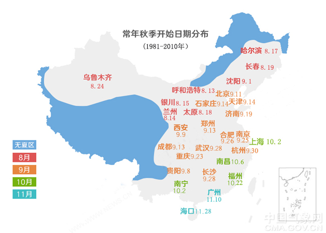 飽受今夏“炙烤”之苦的網友都在盼望著秋天的到來。近期受冷空氣的影響,北方一些城市早晚已經能感受到秋天的絲絲涼意,那么真正的秋天還有多遠?氣象學上通常以5天滑動平均氣溫穩(wěn)定低于22℃的開始時間為秋季開始。從常年平均來看,8月份能進入氣象意義秋季的也只有西北和東北少數(shù)城市,我國大部分地區(qū)還需要等到9月份才能進入秋季,而華南沿海和海南,入秋則要等到11月甚至12月。目前來看,近期的幾股冷空氣有可能推動黑龍江、吉林、內蒙古一帶入秋,但南方的小伙伴還要多等一些時日。