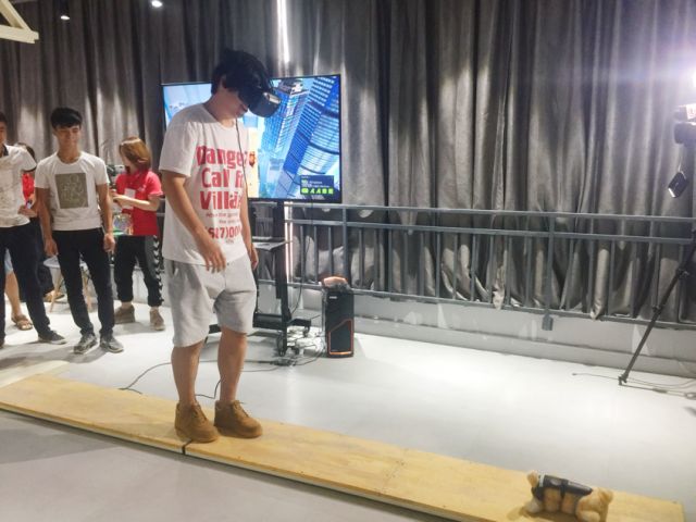 在山路騎行體驗區(qū),體驗者需佩戴VR眼鏡騎車,屏幕上的山路場景會隨移動轉(zhuǎn)換,時而上坡、時而急轉(zhuǎn)彎、時而平緩……車身也會隨場景左右擺動。在高空涉險體驗區(qū),參與者小心翼翼的在平地上移動著腳步,原來在vr的世界里面,體驗者正站在高樓外狹窄的木板上試圖“營救”蜷縮在木板盡頭的“虛擬”小貓。