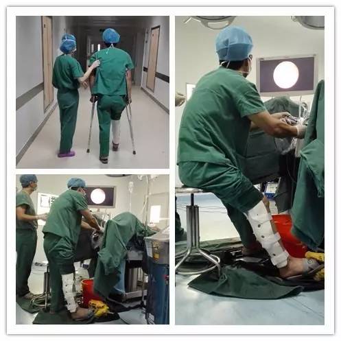 暨南大學(xué)附屬順德醫(yī)院(原“順德區(qū)第二人民醫(yī)院”)耳鼻咽喉頭頸外科副主任李郁明醫(yī)生左腳打著石膏、拄著拐杖還堅(jiān)持為患者做手術(shù)。