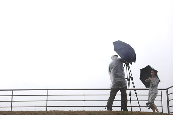 新華社記者邰劍秋、姜雪蘭在上海青草沙水庫(kù)頂著風(fēng)雨做連線(xiàn)直播。
