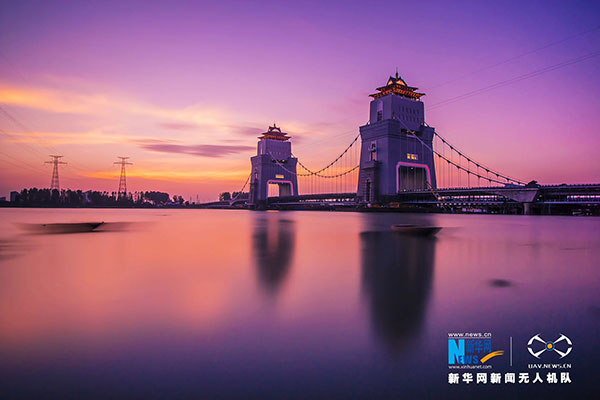 新華網(wǎng)無(wú)人機(jī)隊(duì)拍攝的江蘇揚(yáng)州萬(wàn)福大橋。