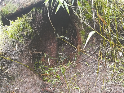 在熊貓幼崽玩耍的樹下,隊(duì)員們發(fā)現(xiàn)了一個(gè)樹洞。根據(jù)大熊貓的生活習(xí)性,隊(duì)員們初步判定這可能是熊貓產(chǎn)仔時(shí)用的樹洞,被發(fā)現(xiàn)的這只幼崽有可能就是在此處被產(chǎn)下的。在樹干上有一些動(dòng)物留下的抓痕,本被綠色植被包圍的樹干上有幾塊變得光禿禿的,隊(duì)員用手測(cè)量了大概的尺寸,根據(jù)抓痕的范圍及新鮮程度,判斷很可能是大熊貓爬樹的痕跡。