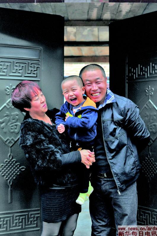 馬愛(ài)威(右)和妻子宋瑞風(fēng)及兒子在家門口合影(2017年10月17日攝)。