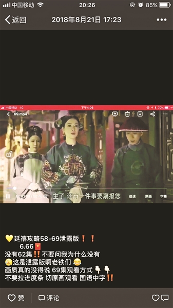 《延禧攻略》《如懿傳》等影視劇正在熱播,劇迷們的追劇熱情持續(xù)高漲,每天盼著劇集更新成為常態(tài)。以《延禧攻略》為例,截至8月23日上午,劇集已更新至56集,在部分視頻網(wǎng)站上充值成為會(huì)員后,可以觀看至64集。但近日,有不少網(wǎng)友發(fā)現(xiàn),網(wǎng)上出現(xiàn)了銷(xiāo)售《延禧攻略》未播劇集的商家。購(gòu)買(mǎi)資源后,可以直接觀看至68集。