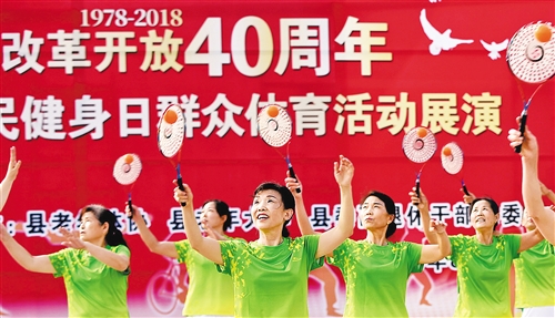 湖北省襄陽市南漳縣舉行群眾體育活動展演。上千名干部群眾分別展示了太極拳劍、健身氣功、柔力球、廣場舞等精彩節(jié)目,紀(jì)念改革開放40周年。 熊明銀攝