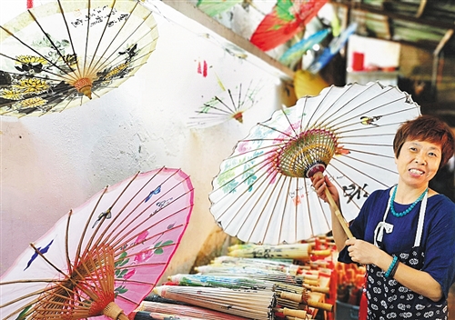 貴州省赤水市大同古鎮(zhèn),油紙傘傳人李珍霞在展示她制作的油紙傘。大同古鎮(zhèn)歷史悠久,擁有“獨竹漂”、竹編、油紙傘等非物質(zhì)文化遺產(chǎn)。 經(jīng)濟(jì)日報-中國經(jīng)濟(jì)網(wǎng)記者 周明陽攝